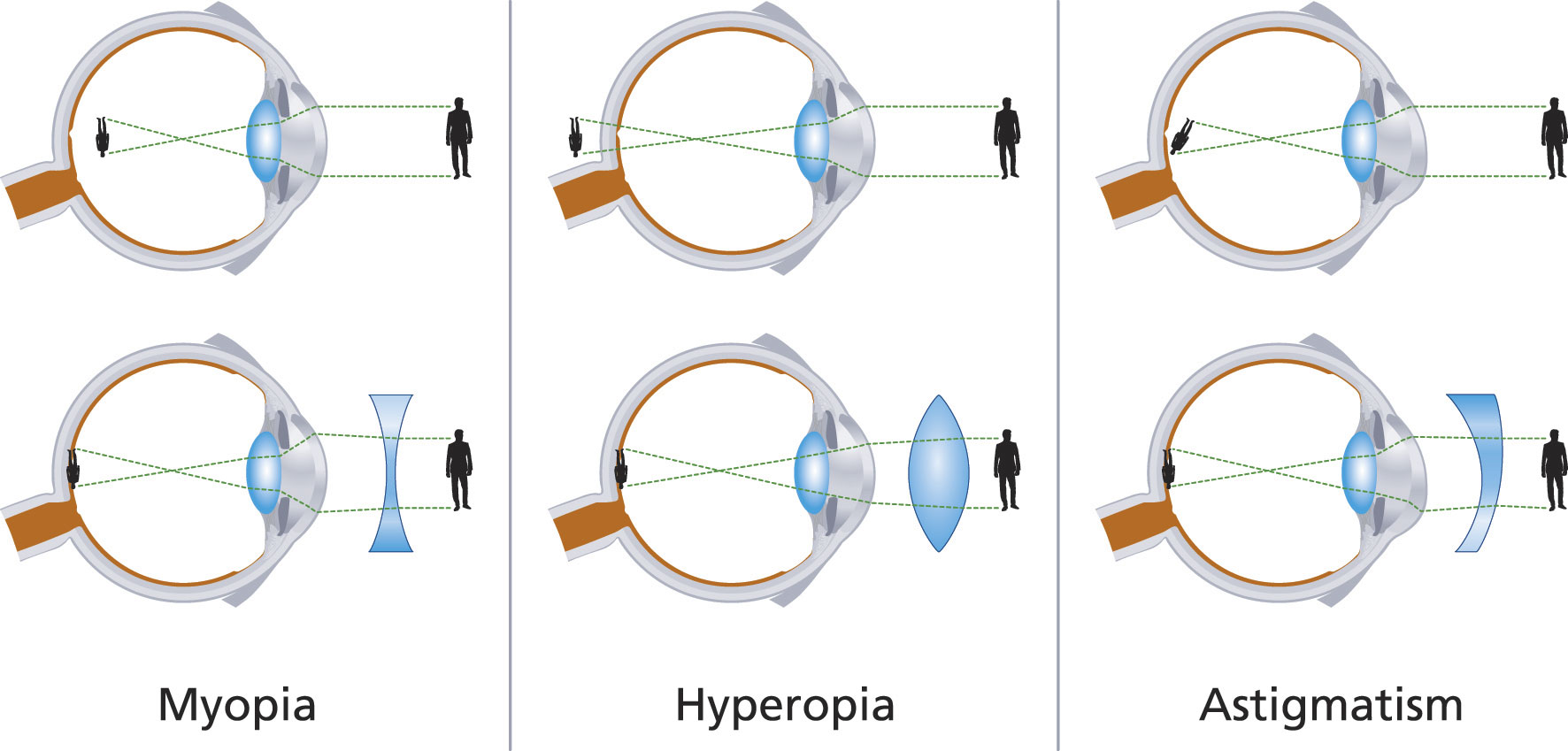 Die Korrektur von Kurz-, Weitsichtigkeit, Astigmatismus und Alterssichtigkeit wird durch Brillen oder Kontaktlinsenerreicht.