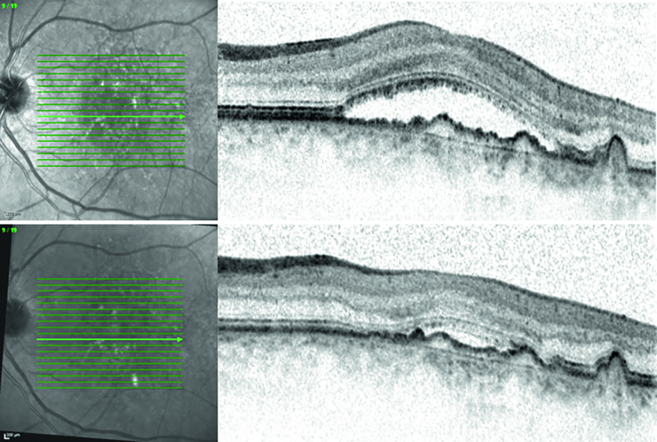Eine feuchte AMD wird meist mit Injektionen behandelt. Dabei werden Medikamente in den Glaskörper injiziert (intravitreale operative Medikamenteneingabe - IVOM). Die OCT-Aufnahme zeigt eine feuchte AMD vor und nach einer IVOM Behandlung, bei der sich die die in der Netzhaut gelegenen Zysten wesentlich resorbiert haben.