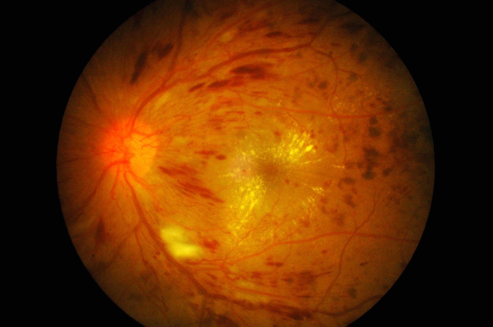 In späteren Stadien kann es zu Gefäßveränderungen,Flüssigkeitsansammlungen und Blutungen in der Netzhaut sowie zur Neubildung von Membranen kommen